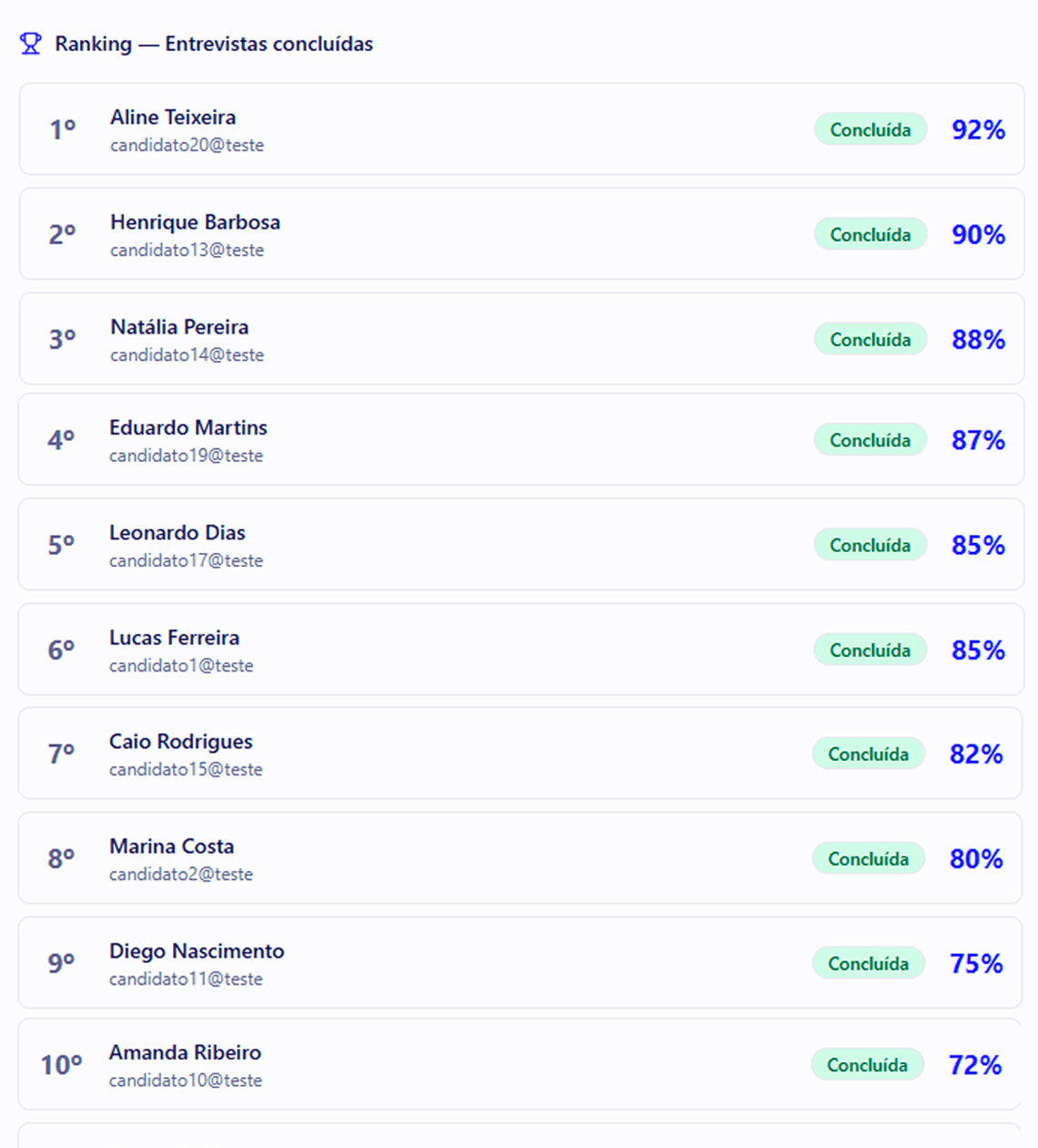 Classificação automática gerada por IA, com base em critérios técnicos, perfil comportamental e aderência à cultura da empresa e às exigências do cargo.
