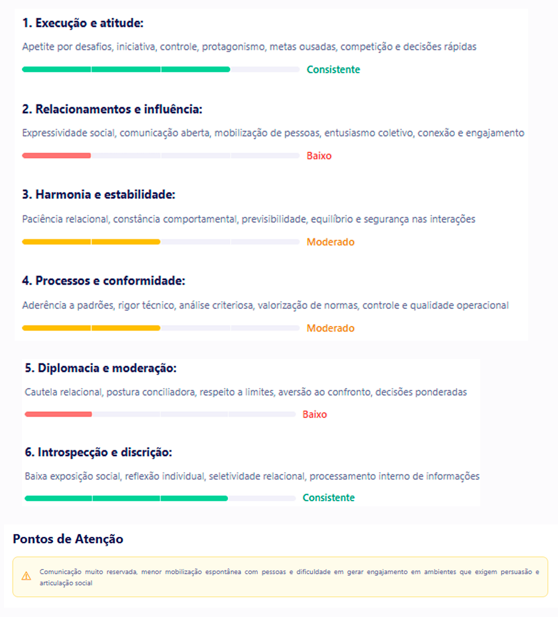 Traduza os dados comportamentais em sinais claros de risco, antecipando conflitos, sobrecargas e desalinhamentos com a função ou ambiente.